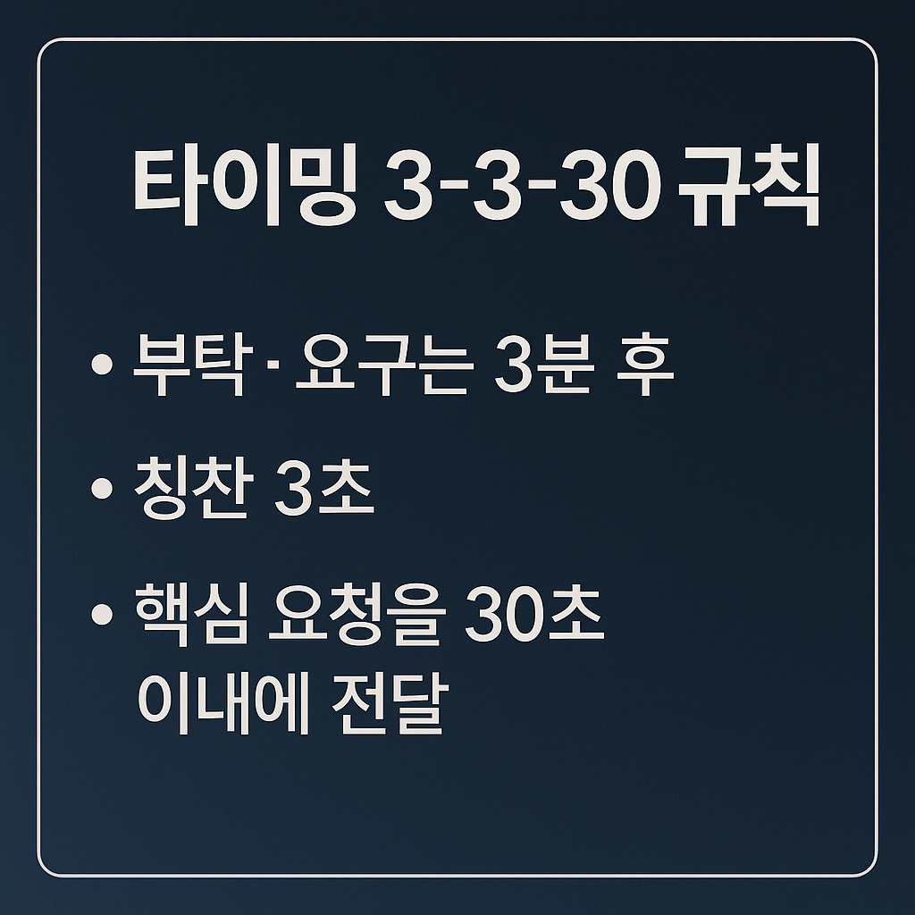 - 타이밍 3-3-30 규칙 – 부탁·요구는 자리 잡고 3분 후 → 칭찬 3초 → 핵심 요청을 30초 이내 에 전달.